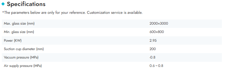The machine frame is welded by quality steel profiles with anti-rust paint finish. The suction cups are suspended on high-strength aluminum profiles.